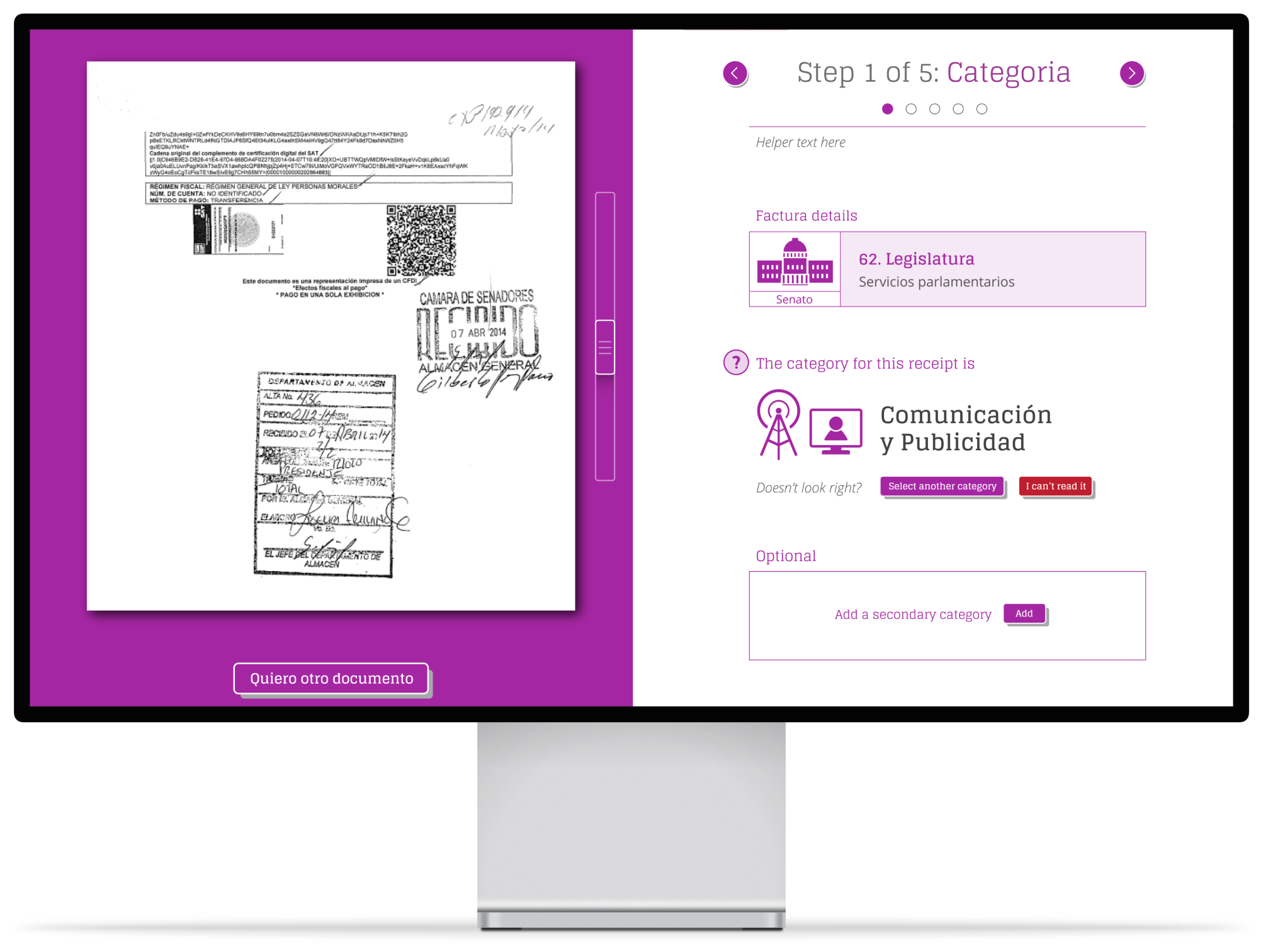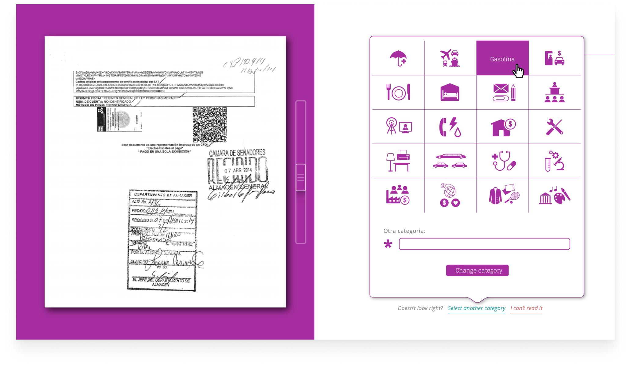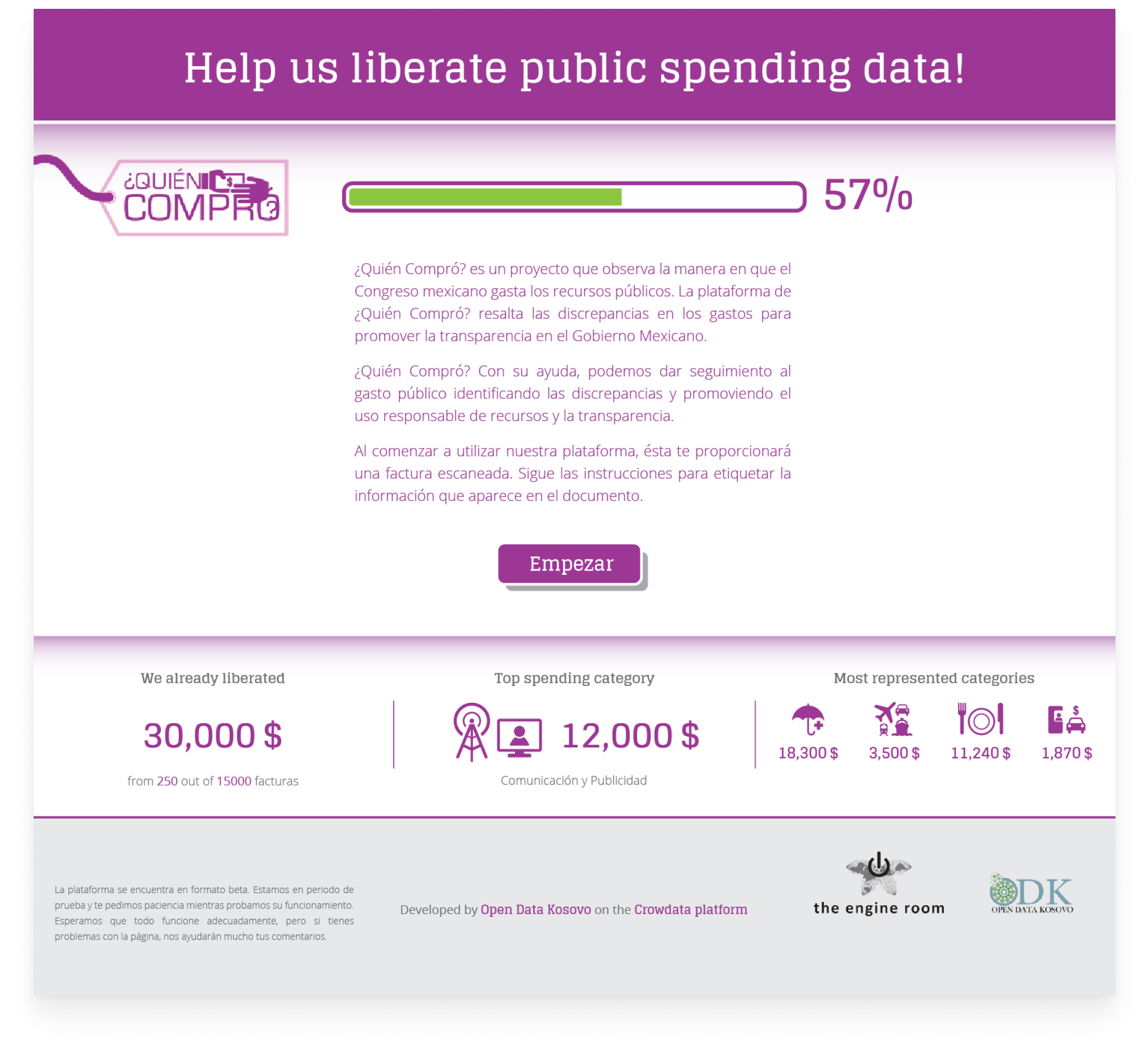 Quien Compro (who bought?) is an online platform tracking how the Mexican congress spends public money. Using freedom of information requests, expenditure documents are pulled and stored in the web app. The copious amounts of data are processed with the help of Mexican citizens through crowd-sourcing their voluntary help.